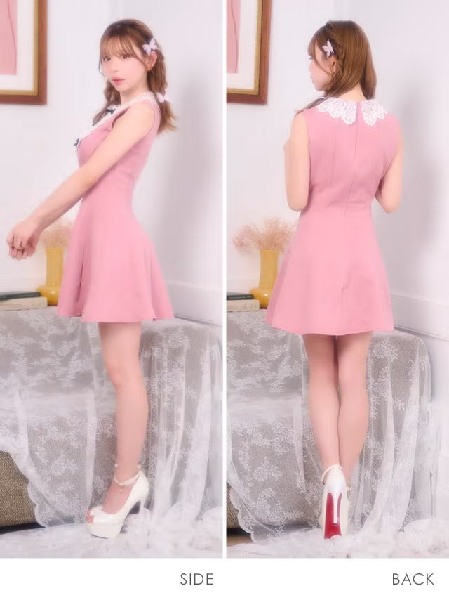 ミニドレス ノースリーブ Aライン レース 襟付き リボン 同伴 胸元カバー 下着のまま ピンク XL キャバドレス のサイド・バック画像