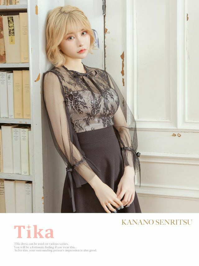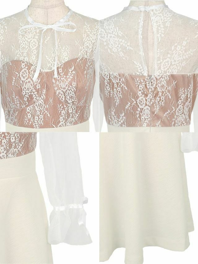 [韓国ドレス] リボン×レースガーリースタイル長袖フレアミニドレス (Sサイズ~Lサイズ) (戦慄かなの/キャバドレス着用)
