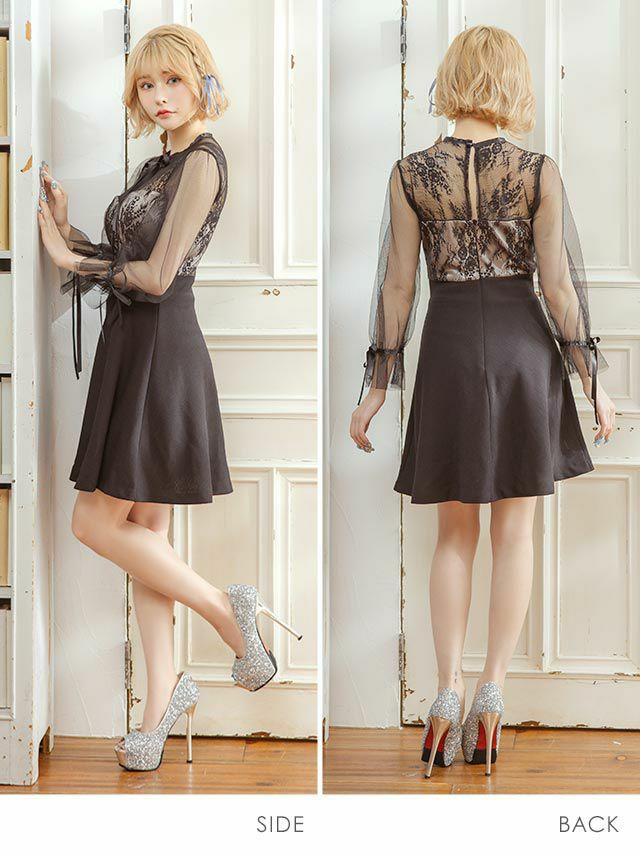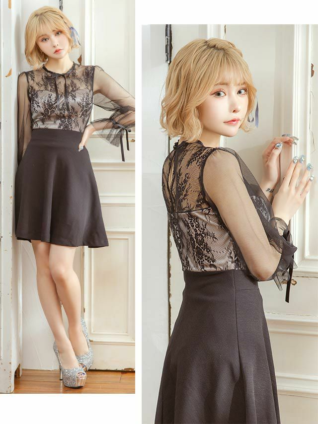 4. 韓国ドレス リボン×レースガーリースタイル長袖フレアミニドレス (Sサイズ~Lサイズ) (戦慄かなの/キャバドレス着用)