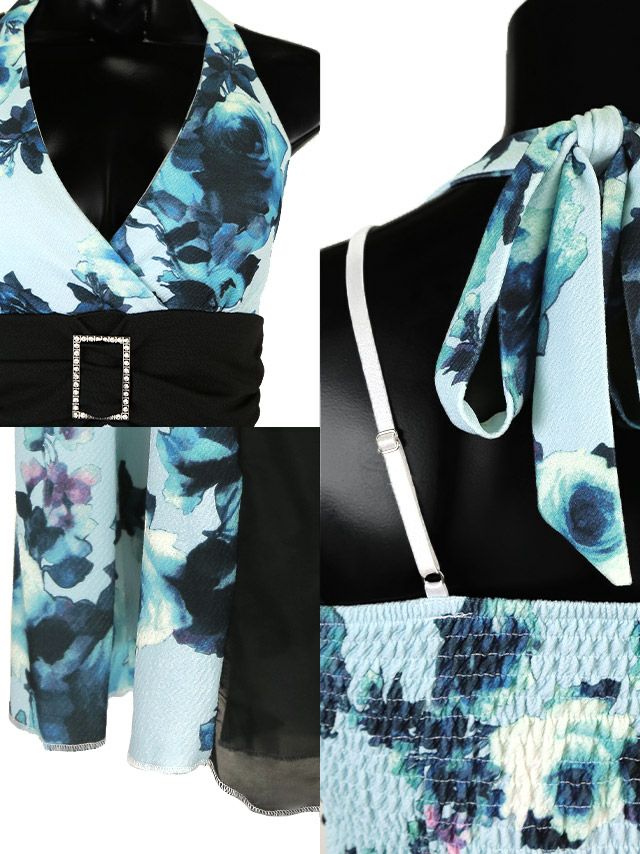 キャバドレス 安い 激安 ミニ丈 キャバクラ クラブ ラウンジ ホルターネック フラワー ウエストベルト シアー切替 タイト ロング ドレス プチプラドレス