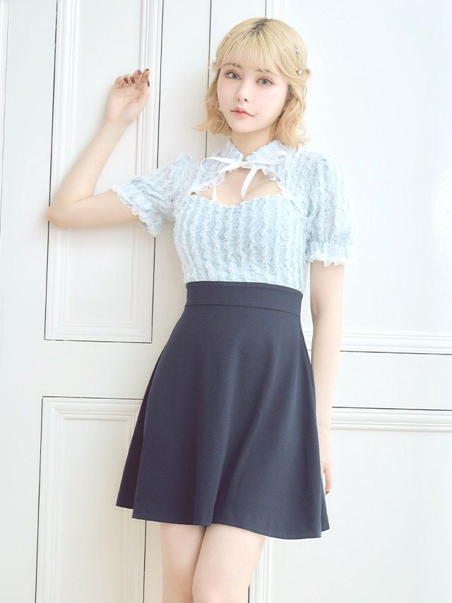 [韓国ドレス] 半袖ふわふわレースネックリボンハイウエスト切替フレアガーリースタイルミニドレス (Sサイズ~Lサイズ) (戦慄かなの/キャバドレス着用)