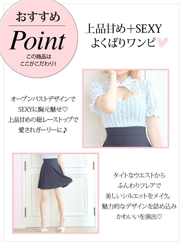 韓国ドレス 半袖ふわふわレースネックリボンガーリースタイルハイウエスト切替フレアミニドレス (Sサイズ~Lサイズ) (戦慄かなの/キャバドレス着用)
