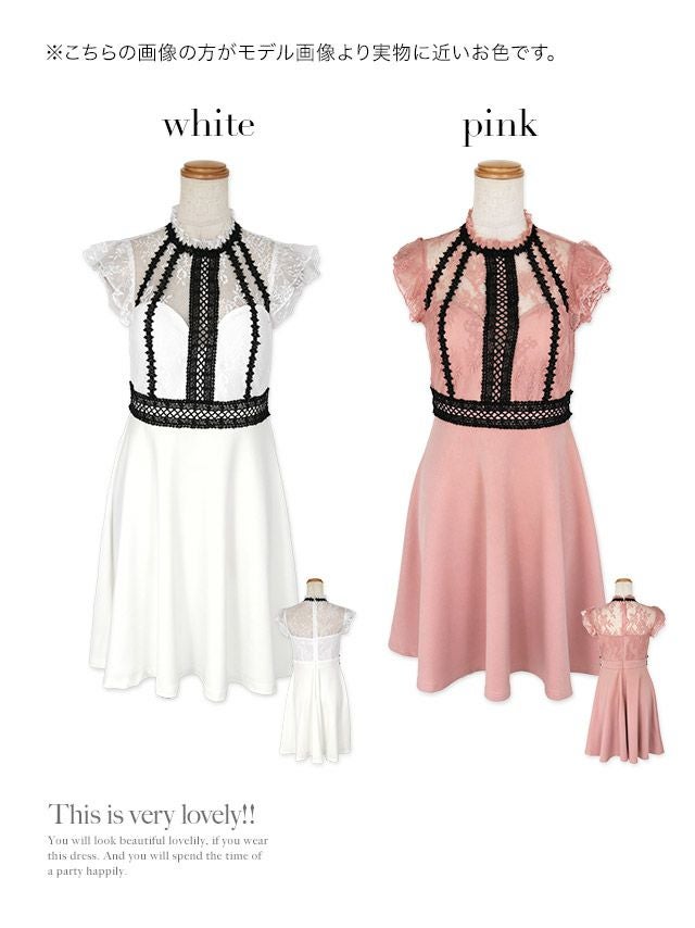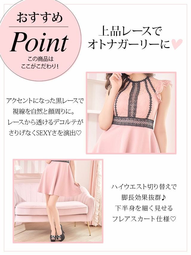 フラワー刺繍ノースリーブフリル袖レーステープハイウエスト切替フレアミニドレス (Sサイズ~XLサイズ) (伊藤桃々/キャバドレス着用)