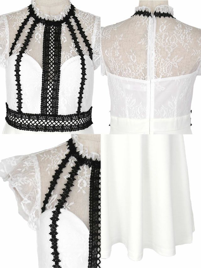 フラワー刺繍ノースリーブフリル袖レーステープハイウエスト切替フレアミニドレスのカラーバリエーション