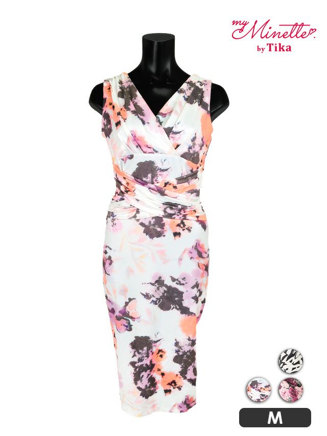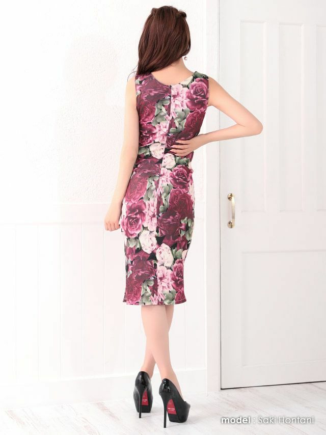 3. [SALE]ノースリーブノースリーブギャザー入り薔薇プリントタイトプチプラ膝丈ドレス (Mサイズ)(本谷紗己/キャバドレス着用)[myMinette/マイミネット]