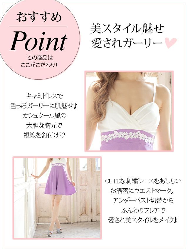 キャミソールカシュクールネック刺繍レースハイウエスト切替フレアミニドレスの商品特徴