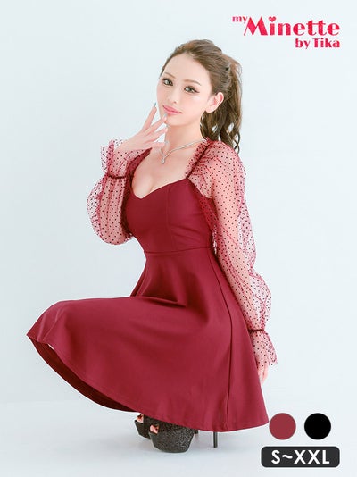 ミニドレス プチプラ 新人 長袖 袖あり ワンピース フレア シアー袖 ドット柄 低身長 ガーリー ワインレッド キャバドレスカラー