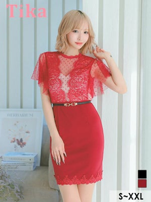 4. [アウトレット]半袖 ドット柄 シアーレース 切り替え ウエストベルト付き タイトミニドレス (Sサイズ~XXLサイズ) (上ノ堀結愛/キャバドレス着用) [Tika/ティカ]