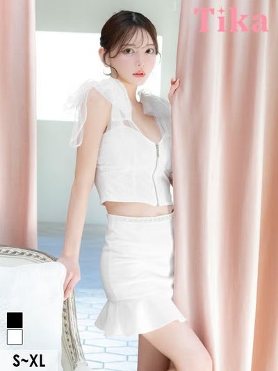 ジップ調節で甘い色気溢れる♡ [新作] ミニドレス タイト セットアップ キャミソール ショルダーリボン ジップ 谷間 裾フリル 黒 XL キャバドレス (聖菜着用) [tk-mds271504a] [Tika/ティカ]