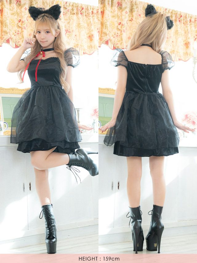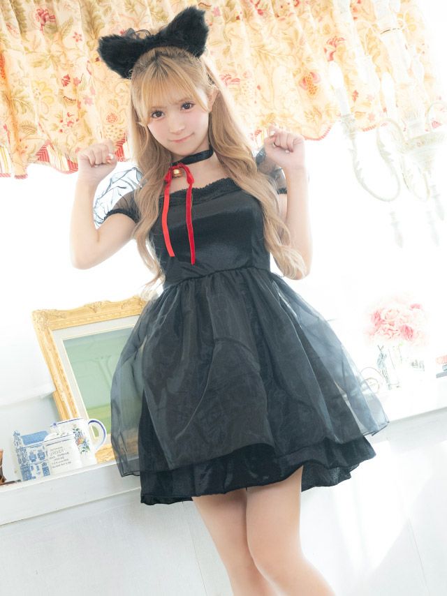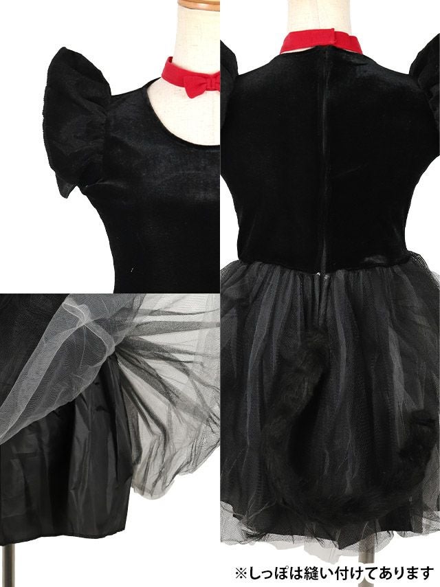 5. コスプレ 親子でお揃いペアふわふわガーリーボリュームチュール体型カバーフレアスカート黒猫アニマル [3点セット] (ワンピース/チョーカー/カチューシャ)
