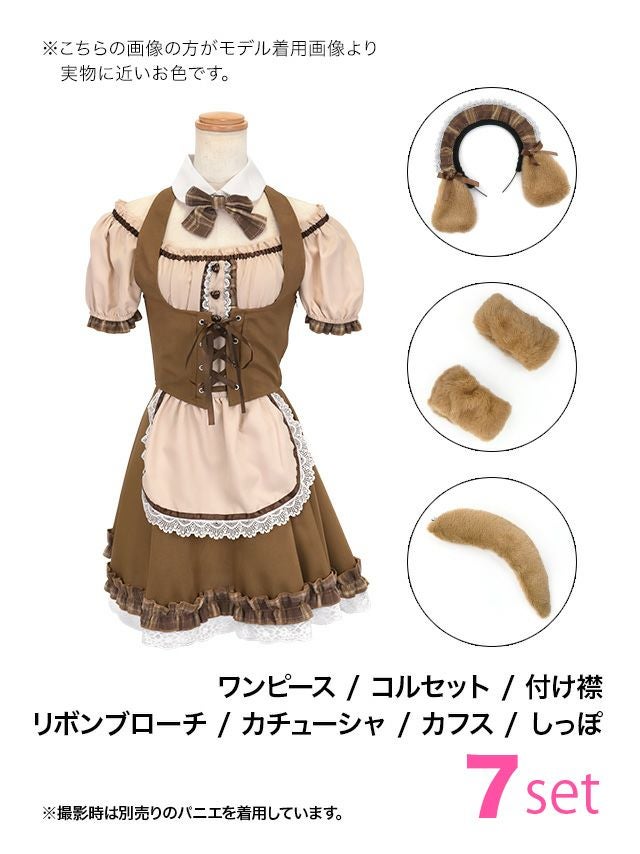 5. コスプレ 体型カバーフレアスカートガーリーメイド犬アニマル [7点セット] (ワンピース/カチューシャ/付け襟/リボンブローチ/コルセット/カフス/しっぽ)