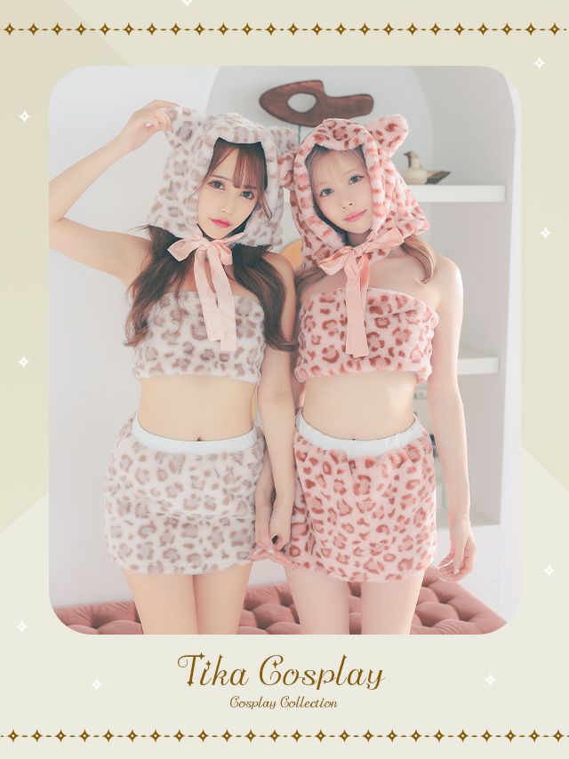 コスプレもこもこレオパードへそ出しチューブトップ×タイトスカートセットアップセクシーペア猫アニマルのフロントバック