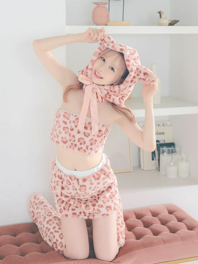 コスプレもこもこレオパードへそ出しチューブトップ×タイトスカートセットアップセクシーペア猫アニマルのカラー画像1枚目