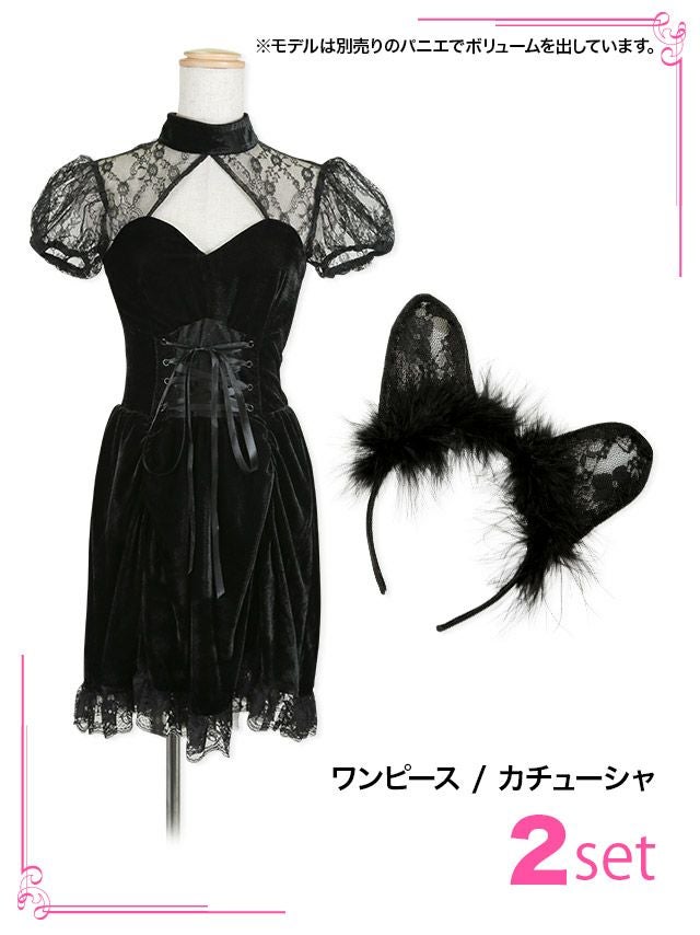 コスプレ ガーリー黒猫レースアップ体型カバーフレアスカートセクシーアニマル [2点セット] (ワンピース/カチューシャ)
