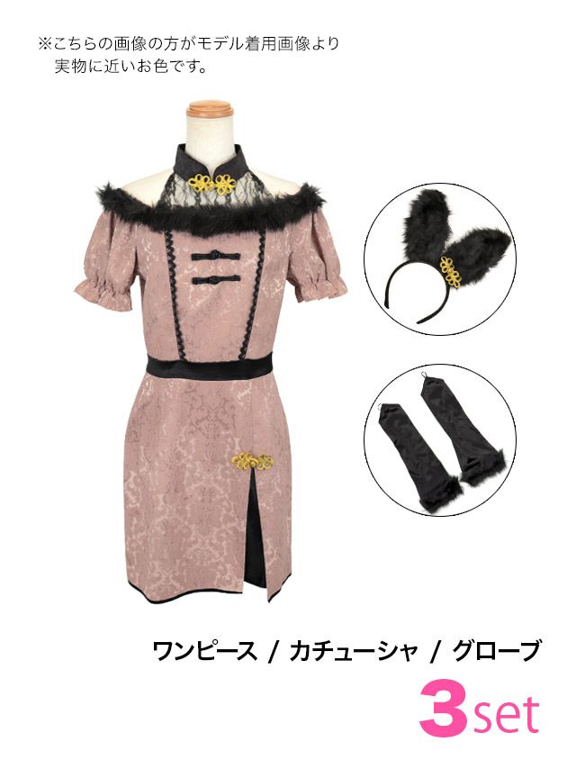 4. コスプレ カットアウトショルダータイトガーリーレトロチャイナバニー [3点セット] (ワンピース/カチューシャ/グローブ)