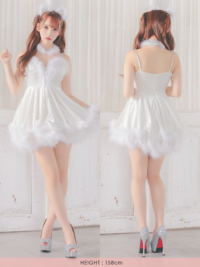 コスプレ ふわふわフェザー体型カバーフレアスカートペアガーリー白猫アニマルのフロントバック