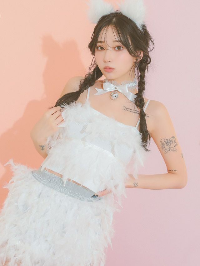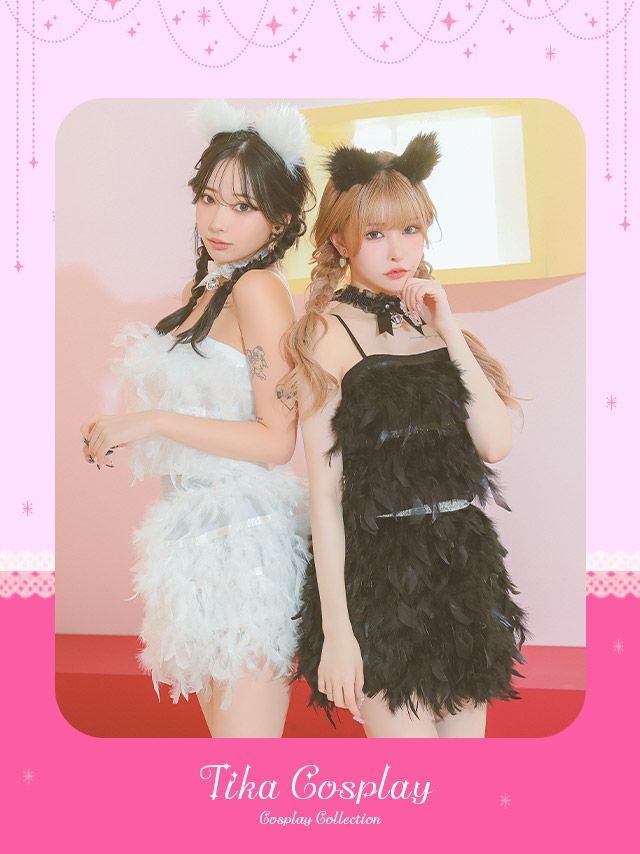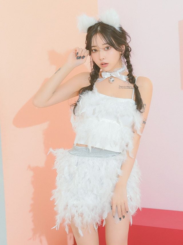 4. コスプレ へそ出しセクシーペアふんわり羽付きセットアップ猫アニマル [4点セット] (トップス/スカート/チョーカー/カチューシャ)