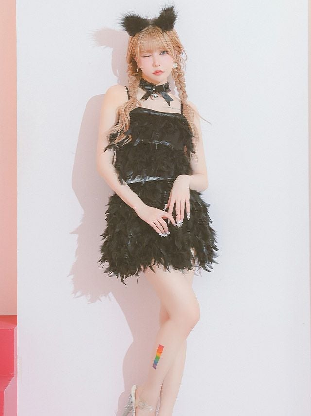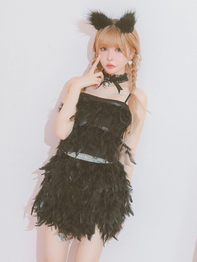5. コスプレ へそ出しセクシーペアふんわり羽付きセットアップ猫アニマル [4点セット] (トップス/スカート/チョーカー/カチューシャ)