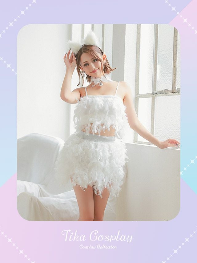 コスプレ フェイクフェザーへそ出しセットアップガーリー猫アニマル [4点セット] (トップス/スカート/チョーカー/カチューシャ)