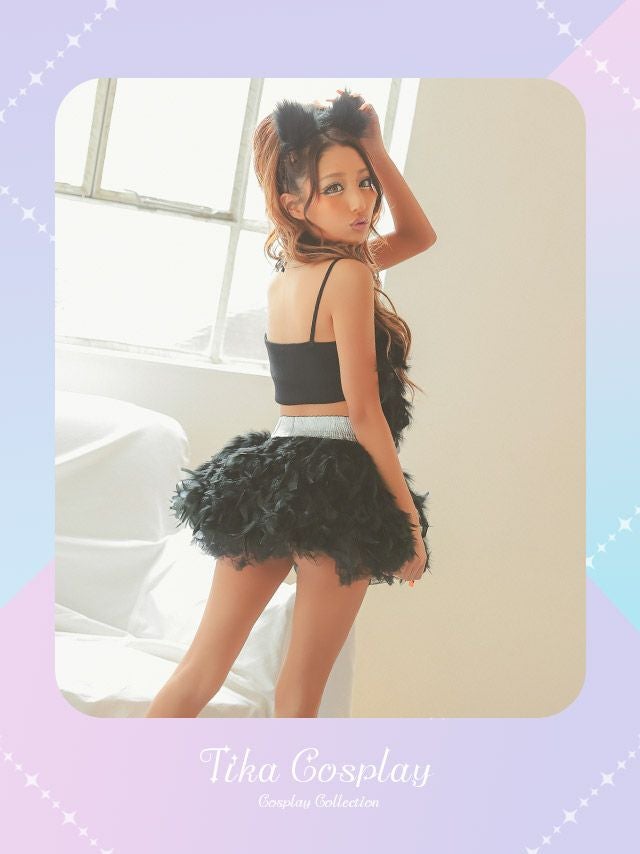 5. コスプレ フェイクフェザーへそ出しセットアップガーリー猫アニマル [4点セット] (トップス/スカート/チョーカー/カチューシャ)