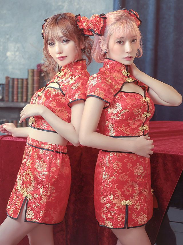 コスプレ バストカットトップス&スリット入りフレアセパレートセクシーペアチャイナドレス [3点セット] (トップス/スカート/お団子カバー)