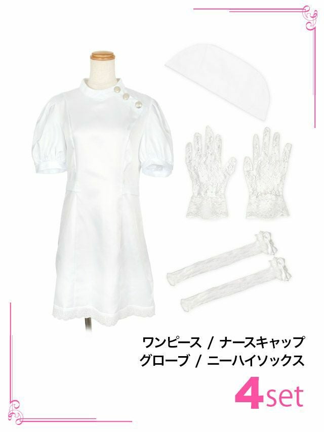 4. コスプレ ロリータ風ワンカラーレース体型カバーセクシーナース [4点セット] (ワンピース/ナースキャップ/グローブ/ニーハイソックス)