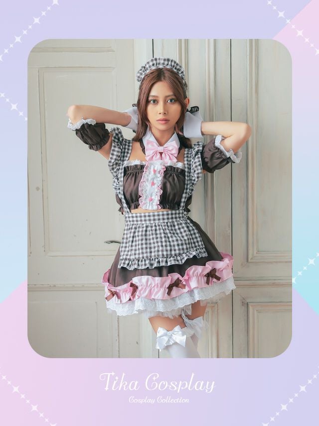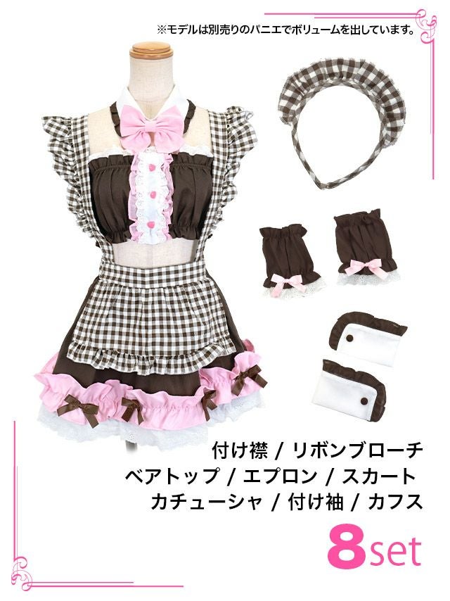 4. コスプレ フリルギンガムチェックヘソ出しセクシーメイド[8点セット] (付け襟/リボンブローチ/ベアトップ/エプロン/スカート/カチューシャ/付け袖/カフス)
