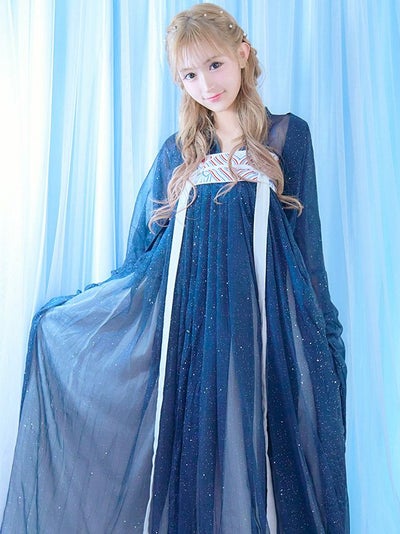 ラメ入り漢服プリンセスチャイナドレス ハロウィンコスプレ3点セットネイビーの物撮り