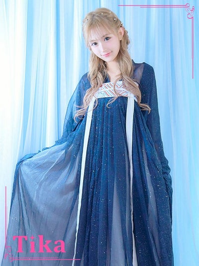 漢服シフォンラメデザインプリンセスチャイナドレス ハロウィンコスプレ3点セットのネイビーセット内容