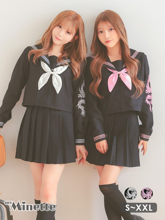 3. [セール][再入荷] コスプレ 龍刺繍入り ミニ丈 体型カバー 袖あり プリーツ フレアスカート セーラー服 [4点セット] (セーラー服上下/スカーフ/ソックス)