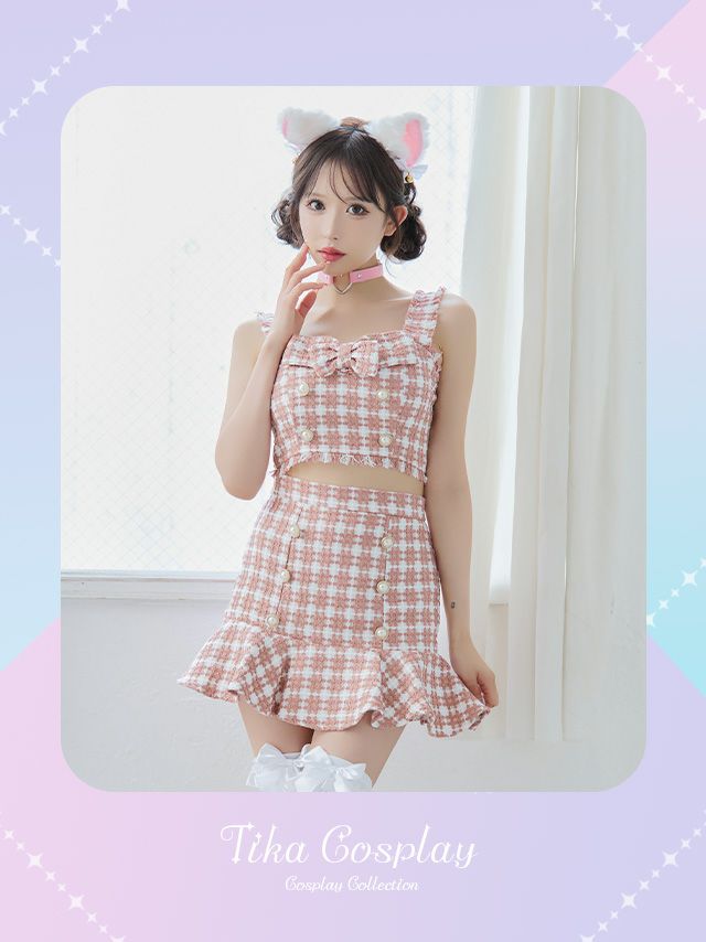 5. [セール]コスプレ へそ出し裾フリルフレアスカートツイード千鳥柄ガーリー猫アニマル [4点セット] (トップス/スカート/カチューシャ/チョーカー)(S~L)