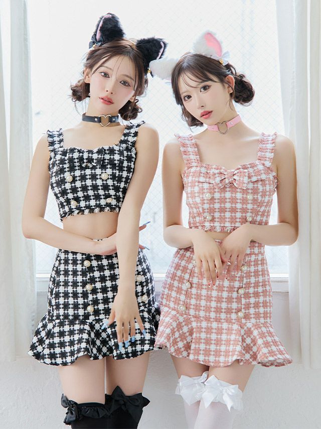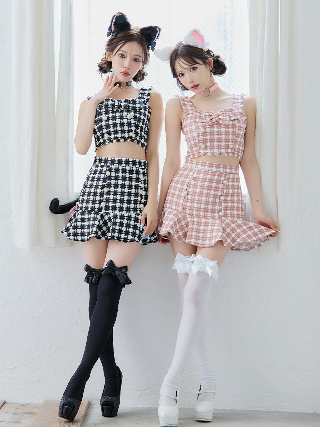 コスプレ へそ出し裾フリルフレアスカートツイード千鳥柄ガーリー猫アニマルのカラー