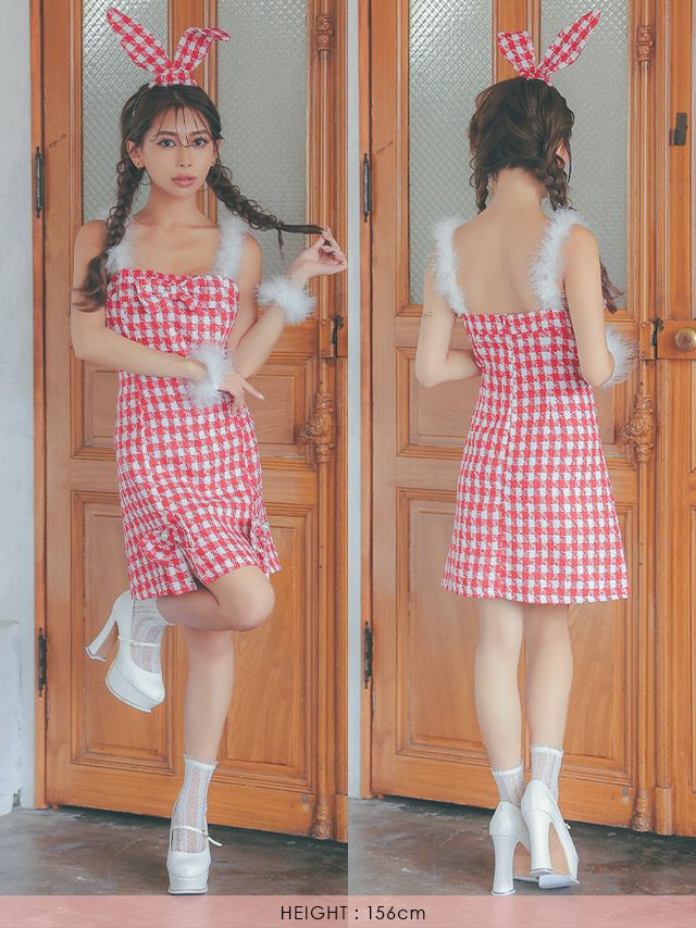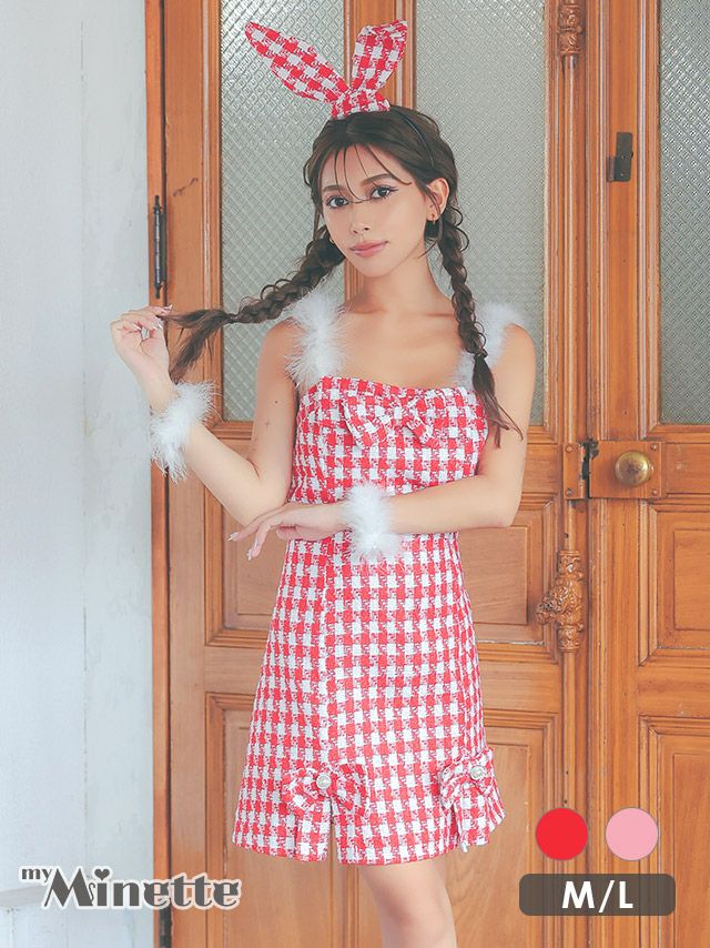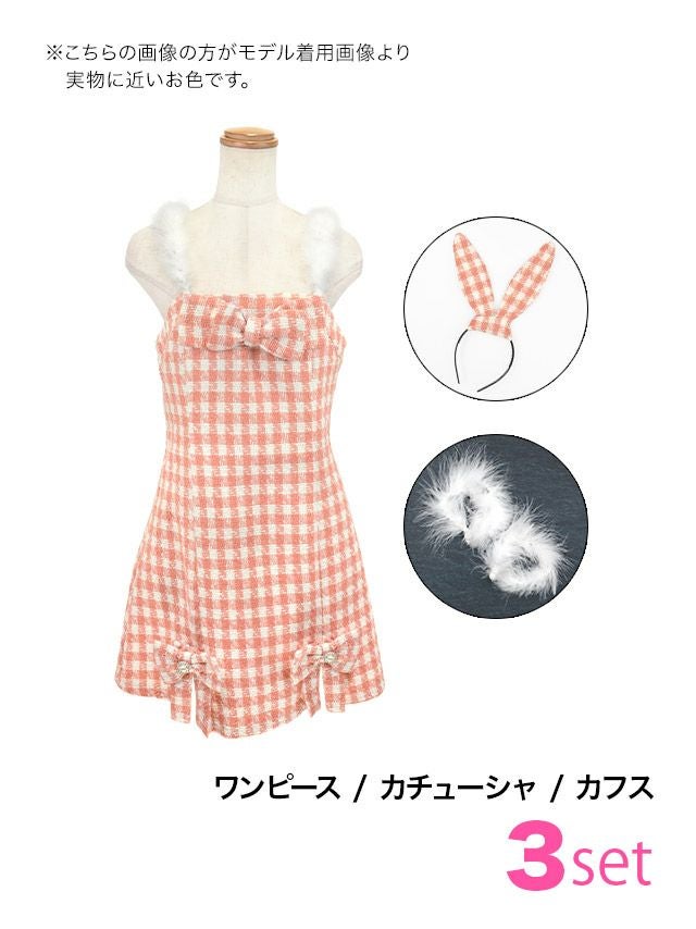 4. [セール]コスプレ ふわふわフェザーショルダーツイードチェックパールリボンガーリーバニーアニマル [3点セット] (ワンピース/カチューシャ/カフス)(M~L)
