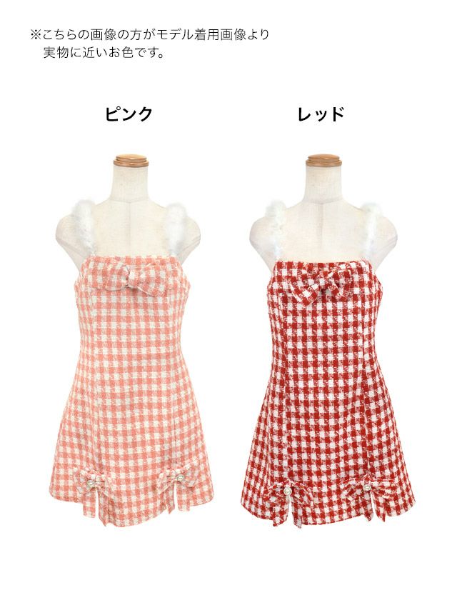 コスプレ ふわふわフェザーショルダーツイードチェックパールリボンガーリーバニーアニマルのフロントバック