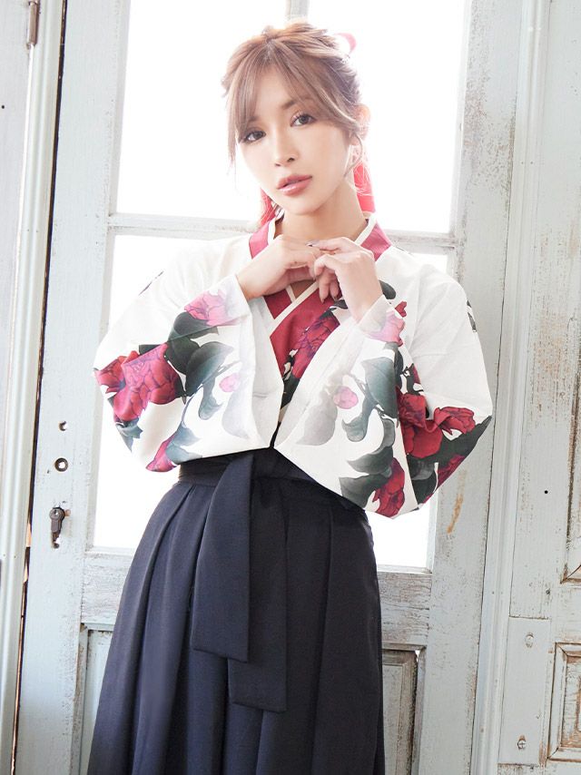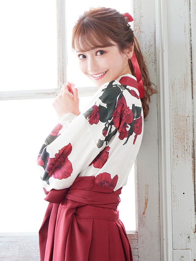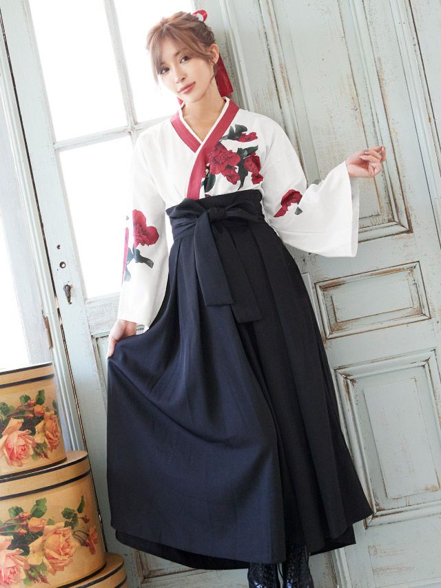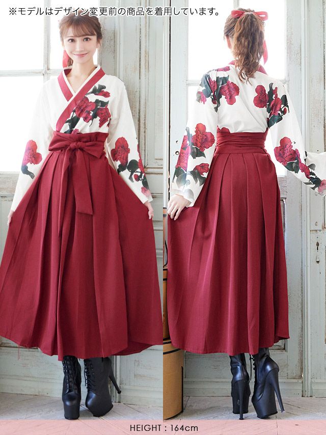 4. [セール]コスプレ フラワーデザイン和装体型カバーロング丈ガーリーレトロ袴 [3点セット] (トップス/袴/リボン2本)