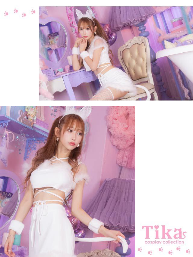 誘惑的なsexyキャット♪ [セール]コスプレ ふわふわフェザー付きクロスセットアップ白猫&黒猫セクシーアニマル [5点セット] (トップス/スカート/カチューシャ/リストバンド/網ニーハイ)