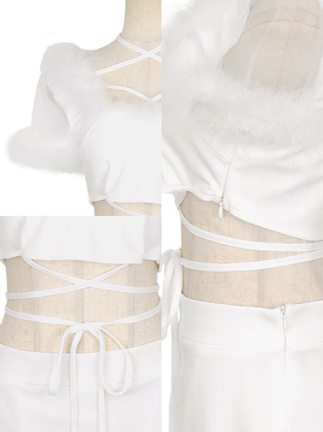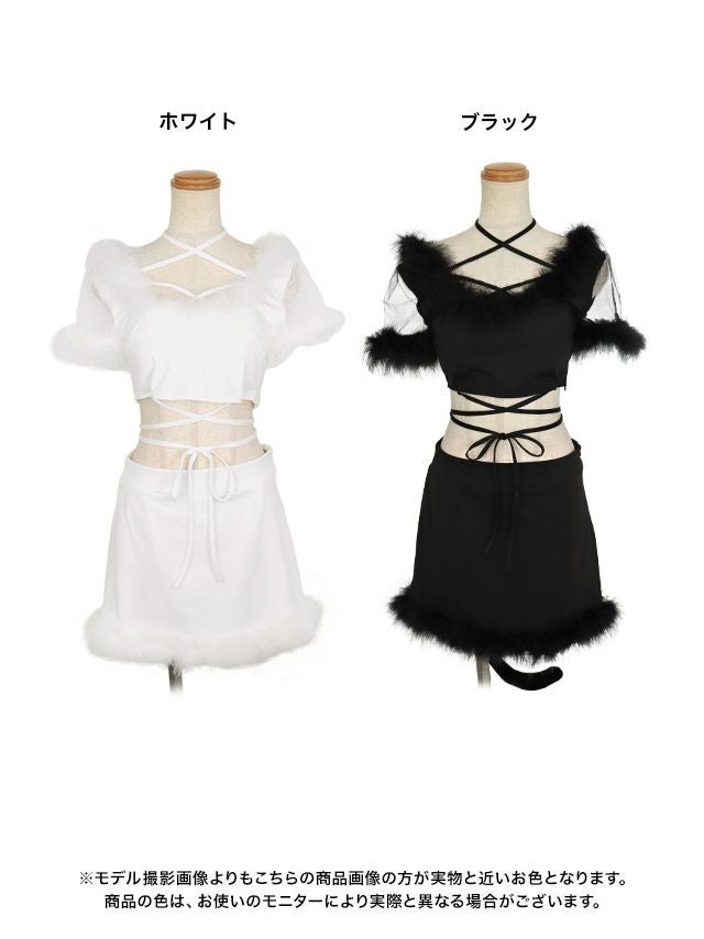 ふわふわセクシー白猫ちゃん♪ [セール]コスプレ ふわふわフェザーセットアップ猫セクシーアニマル [5点セット] (トップス/スカート/カチューシャ/リストバンド/網ニーハイ)