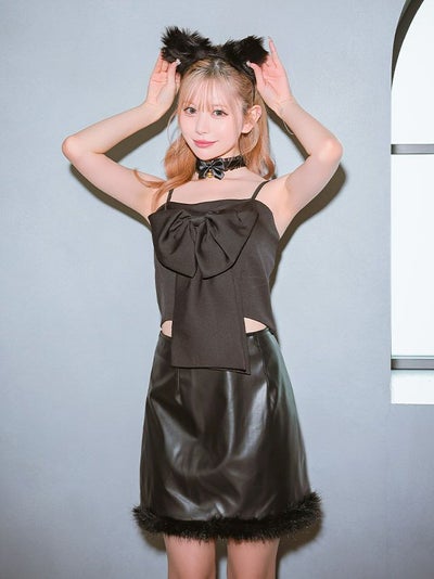 コスプレ へそ出しビッグリボンファーレザータイトスカートセットアップペア猫アニマルのフロントバック