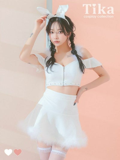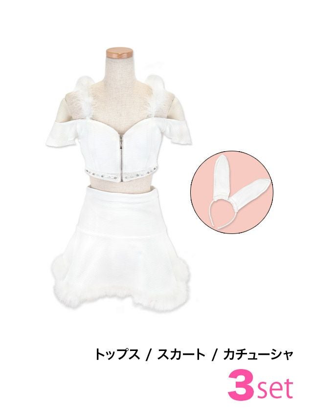 4. [セール]コスプレ へそ出しふわふわフェザー付きフレアスカートガーリーバニーアニマル [3点セット] (トップス/スカート/カチューシャ)(S~L)