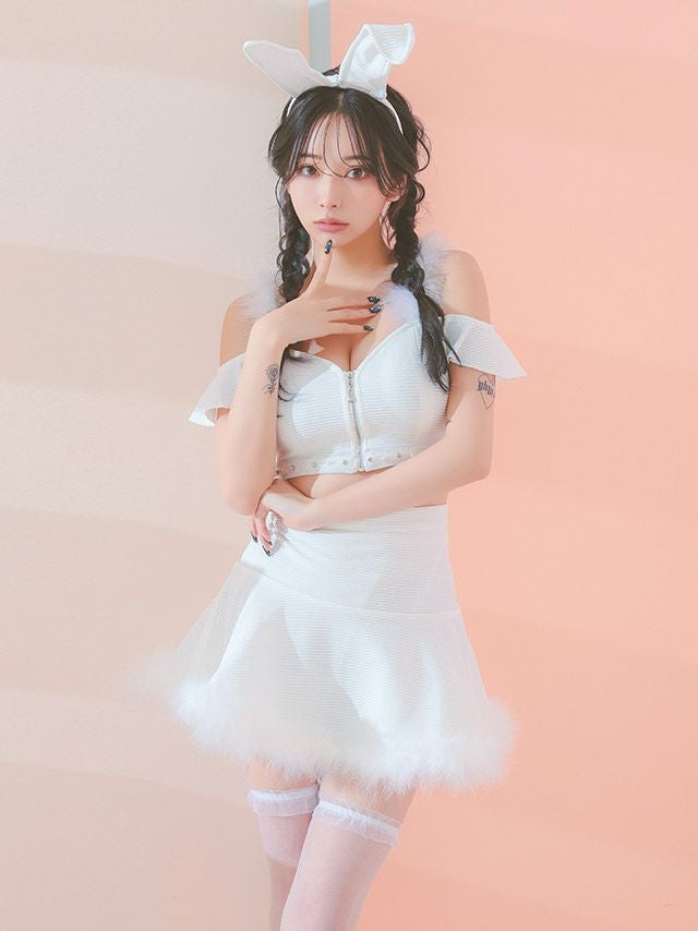 コスプレ へそ出しふわふわフェザー付きフレアスカートガーリーバニーアニマルのフロントバック