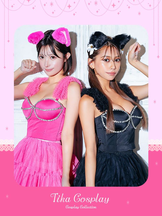 コスプレ ビジュー付きへそ出しビスチェセットアップフィッシュテールフレアスカート猫アニマルの1枚目