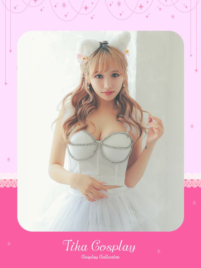 4. [セール]コスプレ ビジュー付きへそ出しビスチェセットアップフィッシュテールフレアスカート猫アニマル [3点セット] (トップス/スカート/カチューシャ)