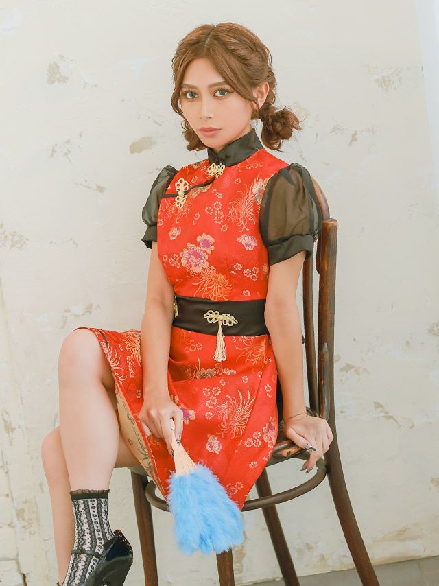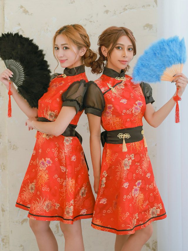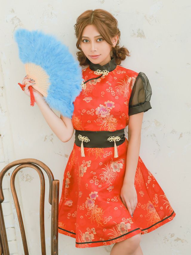 コスプレ ハロウィン チャイナドレス 衣装 仮装 myMinette マイミネット 体型カバー フレアスカート タッセル付き バックリボン シアー 袖あり ガーリー チャイ ミニ ドレス