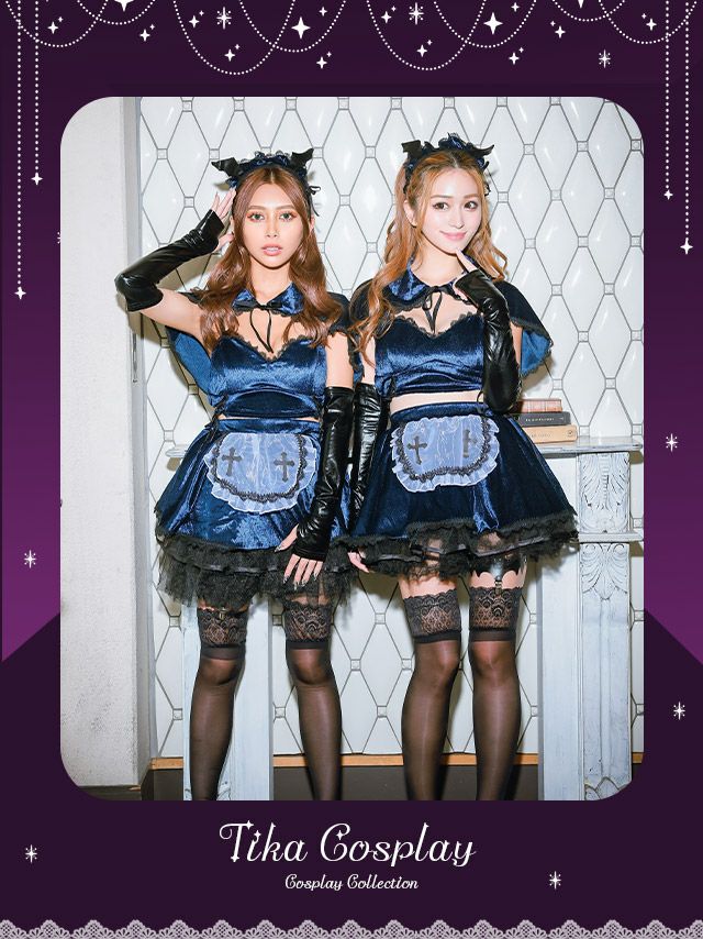 コスプレ ハロウィン メイド服 myMinette マイミネット ベロア へそ出し 体型カバー フレアスカート ペア ダーク セクシー コウモリ メイド