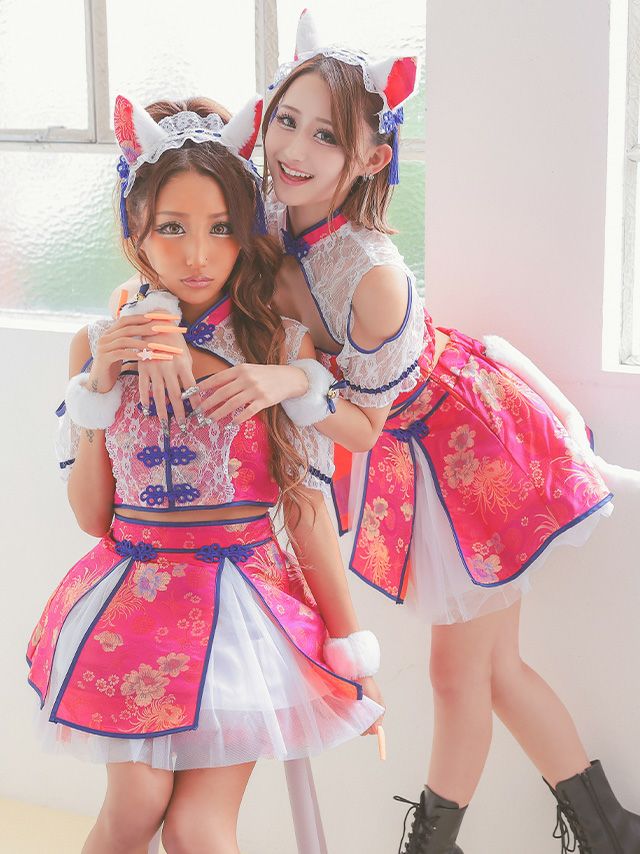 コスプレ へそ出しバストカットチャイナシフォンフレアスカートガーリーペア猫アニマルのセット