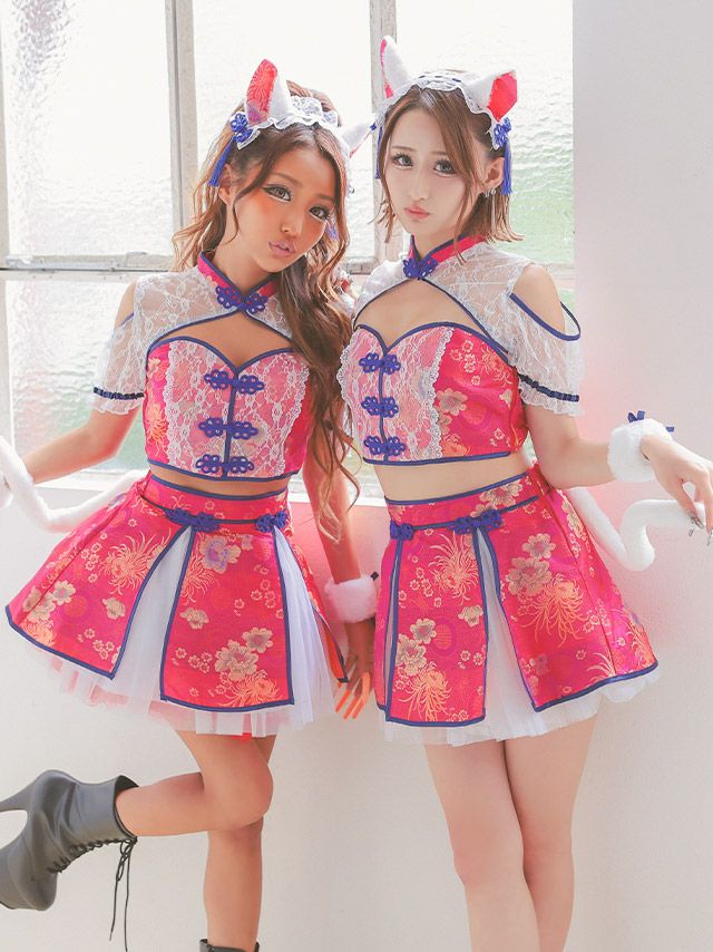 コスプレ ガーリーチャイナへそ出しバストカットシフォンフレアスカート猫アニマルのセット