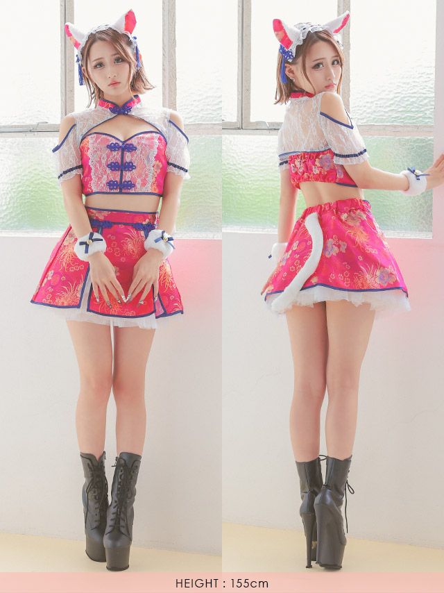 コスプレ ガーリーチャイナへそ出しバストカットシフォンフレアスカート猫アニマルのフロントバック