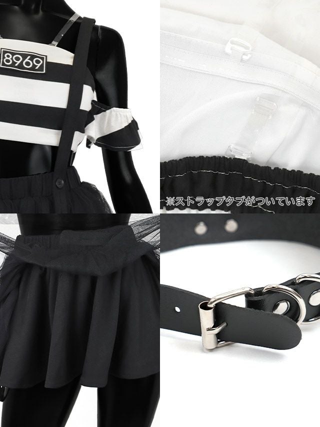 4. [セール]コスプレ チュールフレアスカートセクシーへそ出しサスペンダー付き囚人 [4点セット] (トップス/スカート/帽子/チョーカー&カフス)