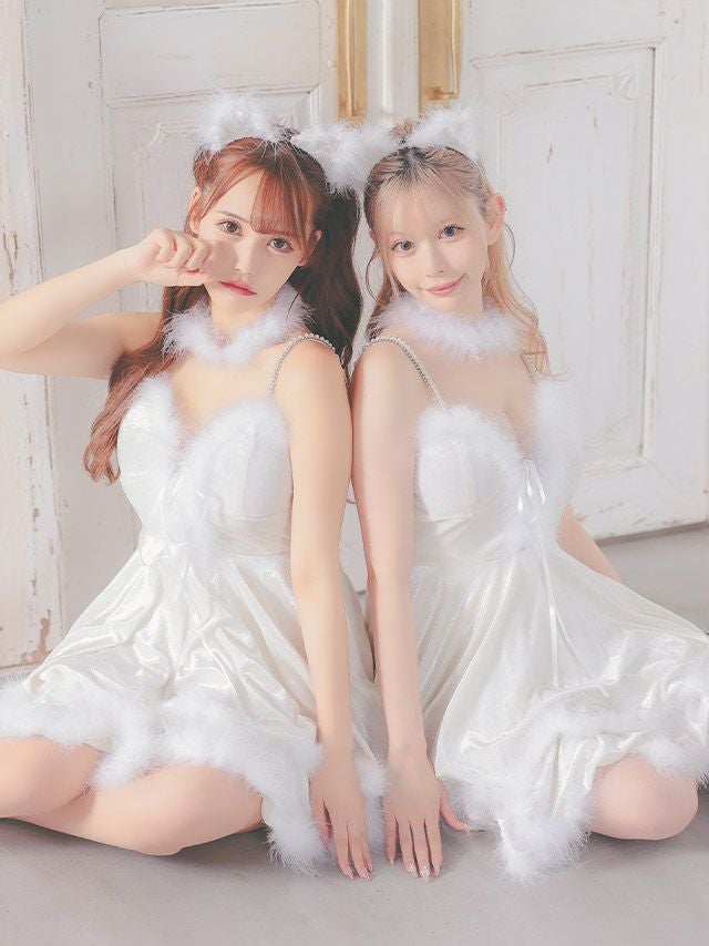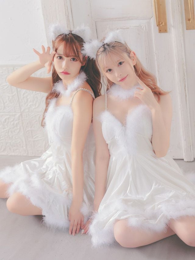 コスプレ ふわふわフェザーバストレースアップ体型カバーフレアスカートガーリー白猫アニマルのフロントバック