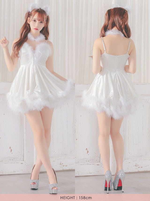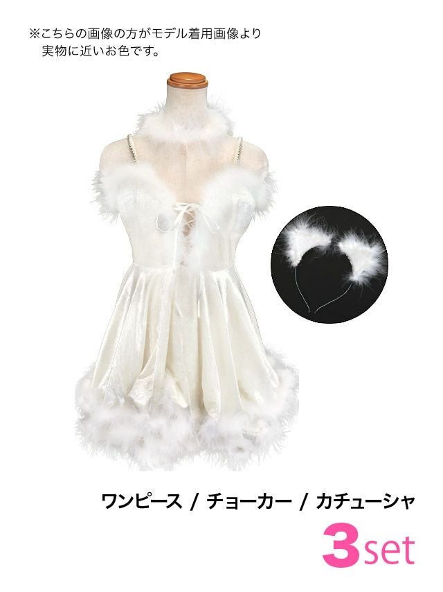 4. [セール]コスプレ ふわふわフェザーバストレースアップ体型カバーフレアスカートガーリー白猫アニマル [3点セット] (ワンピース/チョーカー/カチューシャ)(S~L)